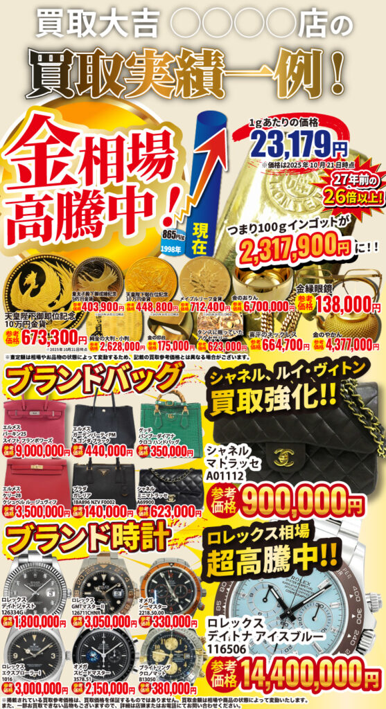 キャンペーン実施店舗 よくあるご質問 買取価格は主にどんな要素から決まるのでしょうか? お品物の状態や付属品の有無、最新相場、流通量などによって買取価格を算出します。 どんなものを買い取ってもらえますか? 金・貴金属・ブランド品はもちろん、お値段がつくか迷われているものも是非お持ちください。 傷や汚れのあるアイテムでも買取可能ですか? 大歓迎です。未使用品などのお持ち込みは少なく、傷や汚れのあるアイテムをお持ちいただく方が半数以上です。状態の悪いお品物やカビなどがあってもお買取可能なケースもございます。 どんな情報があればすぐに査定額を教えてもらえますか? お品物の名前や種類、状態、またはブランド名、型番などの情報があると、概ねの査定額をお伝えできるかと思います。 店舗での査定時間はどのくらいですか? お品物の種類や個数にもよりますが、約5分から30分ほどの査定時間となるケースが多いです。事前にある程度の査定時間をお伝えいたしますので、ご安心ください。